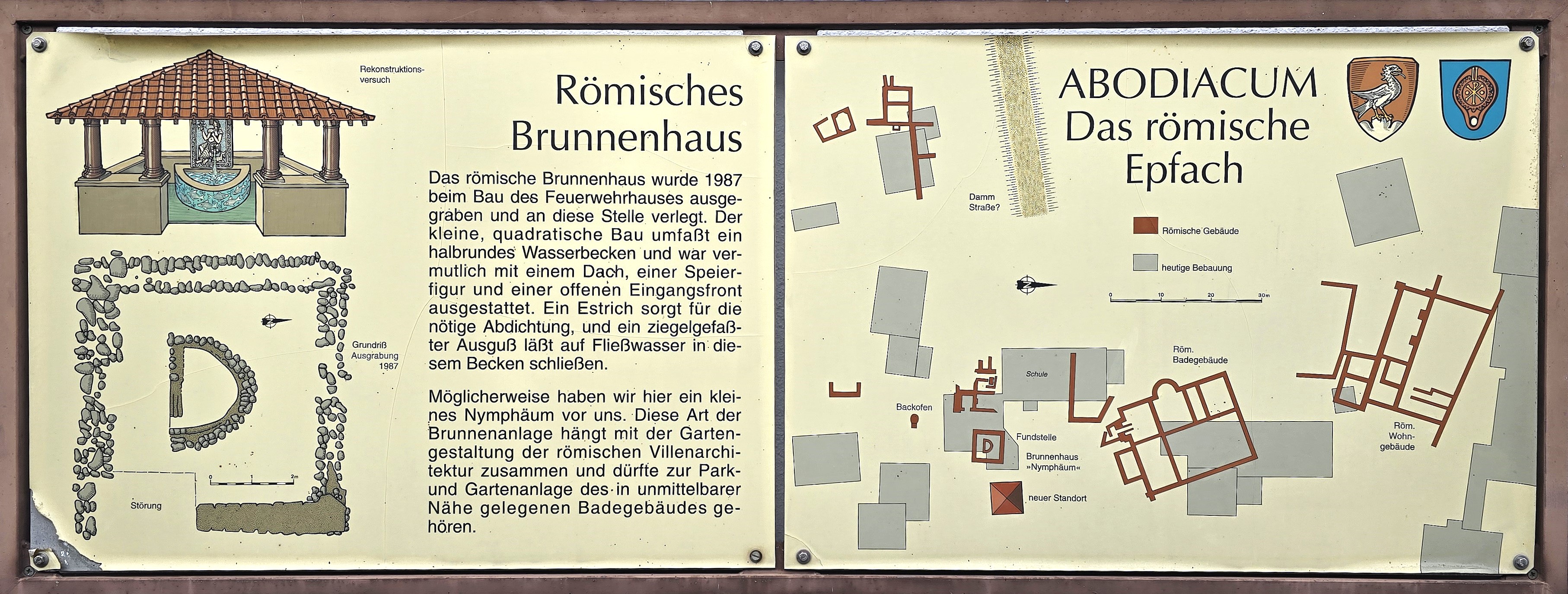Das "Museum Abodiacum", das in einem ehemaligen Feuerwehrhaus in der Ortsmitte untergebracht ist, gibt in Texten, Modellen und ausgewählten Funden einen Überblick. Es ist täglich von 10:00 Uhr bis 17:00 Uhr geöffnet. Die Ausstellung zeigt originale Funde wie Münzen, Keramik und Waffen, Modelle römischer Gebäude sowie einen lebensgroßen Legionär. Ein besonderer Schwerpunkt liegt auf Claudius Paternus Clementianus, dem bedeutendsten bekannten römischen Bürger Epfachs.