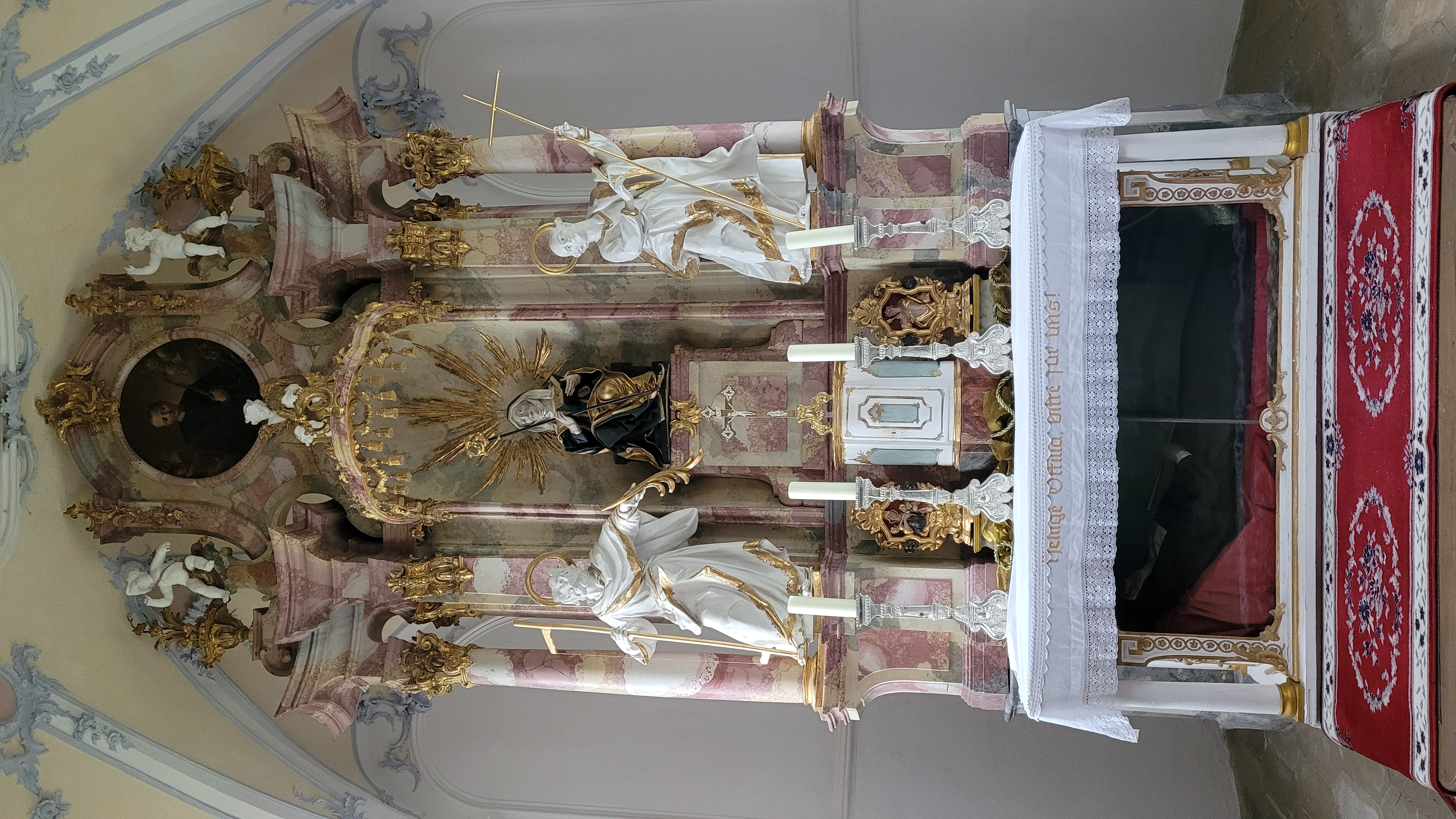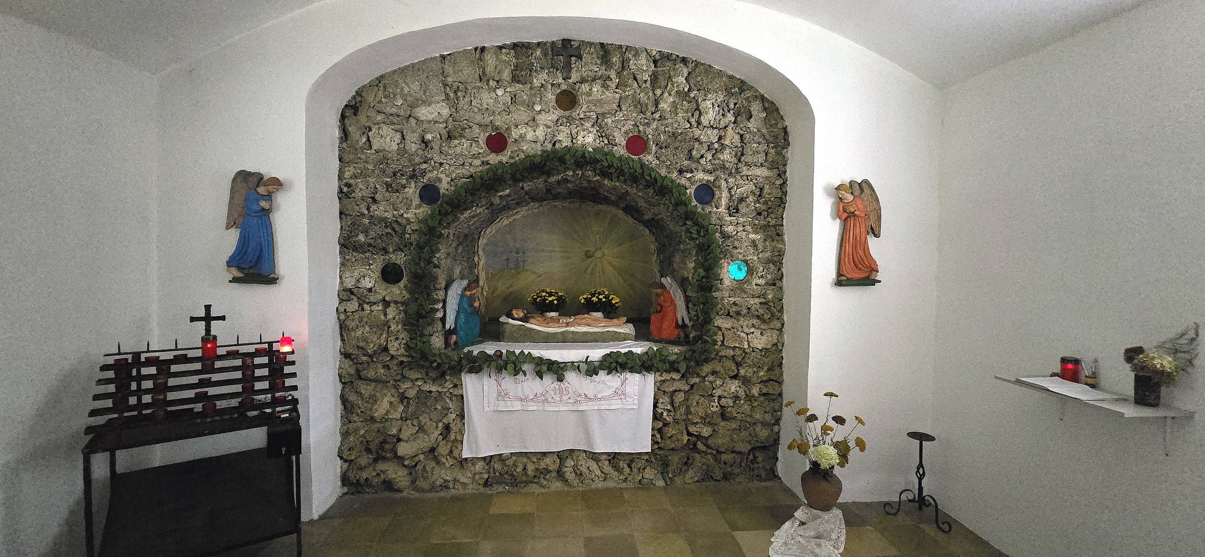 Oben auf dem Plateau erwartete uns eine überlebensgroße Kreuzigungsgruppe und eine schlichte Kapelle, die bis zu ihrer Umgestaltung im Jahre 1878 der frühchristliche Märtyrin Apollonia geweiht war. Apollonia steht für innere Stärke, Schmerzbewältigung und Glaubenstreue. Wenn man die Kapelle betritt, fällt der Blick sofort auf das mit Tuffsteinen gestaltete heilige Grab. Die Christusfigur liegt in einer Nische in der Mitte einer mit Tuffstein ausgemauerten Wand. Einige farbige Glasscheiben die in den Tuffstein eingearbeitet sind erinnern an Glaskugeln der heiligen Gräber, die früher an Karfreitag in vielen Kirchen aufgebaut waren. Die ca. 50 cm große Holzstatue der heilige Appolonia mit ihren Attributen, einer Zange mit einem Zahn, wurde in den 90er Jahren zur Sicherheit in den Pfarrhof verbracht.