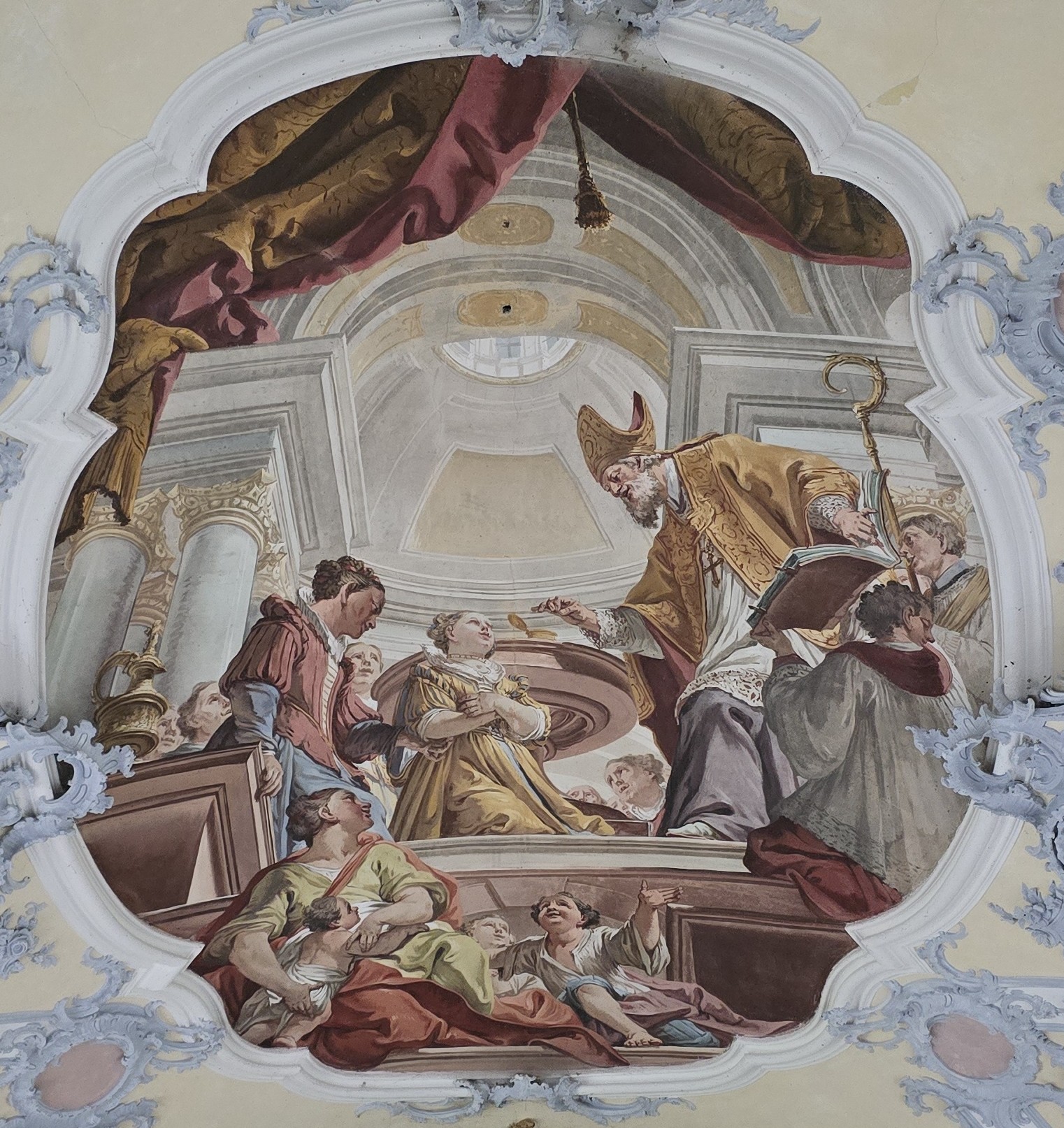Das Deckengemälde im Chor zeigt die Taufe der hl. Ottilie. Es stammt von Matthäus Günther, einem Meister des Rokokos. Das mehrfach übermalte Fresko im Langhaus von Sebastian Jaud aus Haid bei Wessobrunn stellt die Heilung eines Blinden durch Christus dar.
