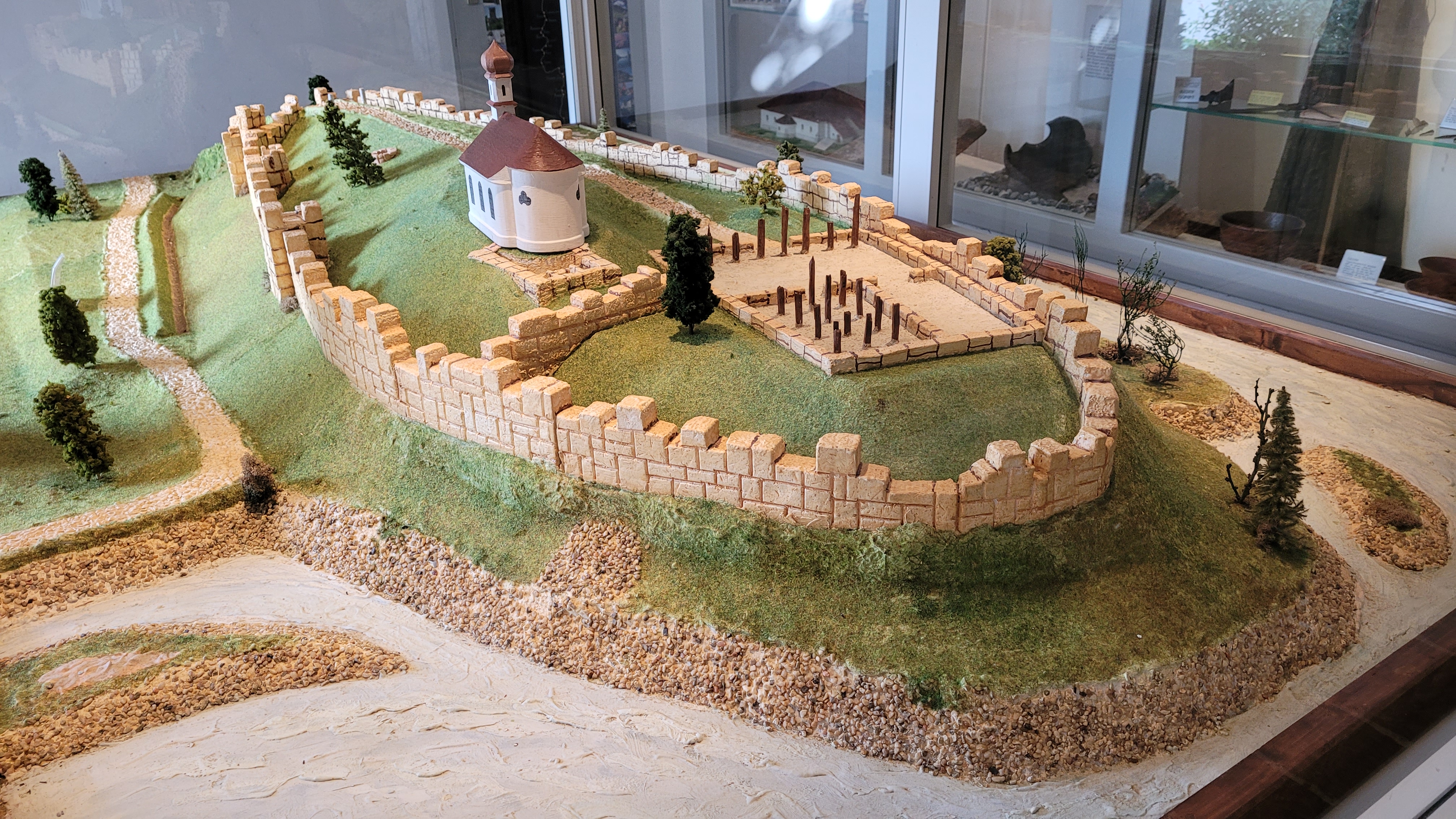 Auf dem Weg nach oben hatten wir einen Blick auf Reichling. Albin verwies auf Grabügel aus der Hallstattzeit. Zudem war hier auch der Schauplatz der Schlacht von Epfach im Jahre 743 n. Chr., wo ein Machtkampf zwischen den Karolingern und dem bayerischen Herzog Odilo stattfand. Herzog Odilo soll am Lech bei Epfach eine Befestigungsanlage errichtet und die Söhne von Karl Martell, Pippin und Karlman, verspottet haben. Diese jedoch reagierten mit einem nächtlichen Überraschungsangriff, bei dem das bayerische Heer überrumpelt und größtenteils vernichtet wurde.