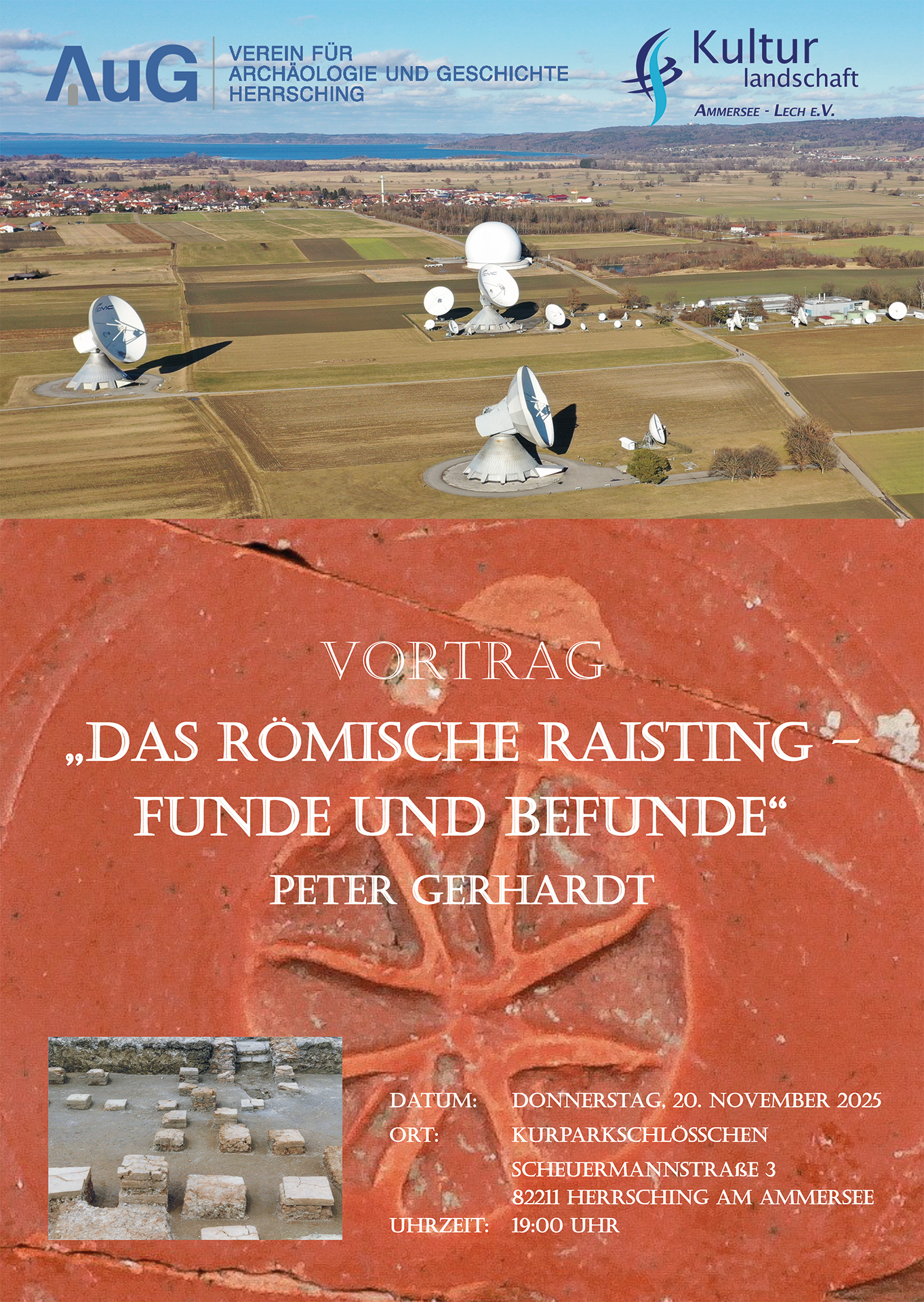 Am 20. November hielt der provinzialrömische Archäologe Peter Gerhardt einen Vortrag über das Römische Raisting und die dortigen Funde und Befunde. Er begann mit einem Überblick über die geschichtlichen Zusammenhänge der römischen Expansion. Während Gallien und das benachbarte Noricum bereits unter römischem Einfluss standen, blieb das Alpenvorland zwischen Schwarzwald, Donau und Inn zunächst außerhalb römischer Kontrolle.